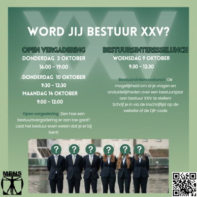 De sollicitaties voor het 25ste bestuur der Studievereniging Mens zijn sinds maandag 30 september open. Hiermee gaat de sollicitatiecommissie op zoek naar het volgende bestuur. Ben jij onze nieuwe aanwinst? Het bestuur ingaan geeft je de mogelijkheid om je steentje bij te dragen aan de vereniging, jouw ideeën uit te voeren om de vereniging te verbeteren én jezelf buiten je studie nog verder te ontwikkelen en uit te dagen. Meer informatie over de verschillende functies is te vinden op de posters in de Mens-kamer, deze worden de komende weken ook op de sociale media geplaatst. Mocht je niet kunnen wachten is een overzicht van de functies ook hier te vinden.