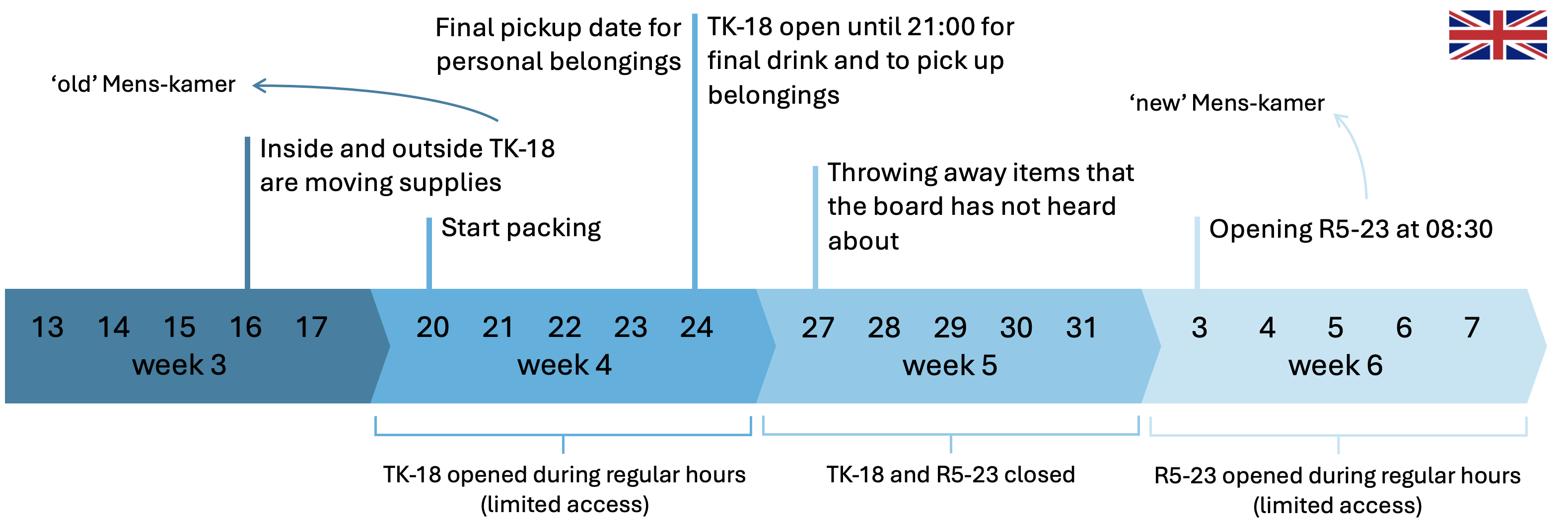 For now this is all the information we can currently give you regarding the relocation. A summary of the most important points can be found below. In case you have any specific questions regarding the relocation you can always send an email to bestuur@mens-vu.nl. The XXIVth board wishes all members a great goodbye to TK-18 and goodluck in the exam week. After the relocation we hope to receive everyone soon in WN-R523!